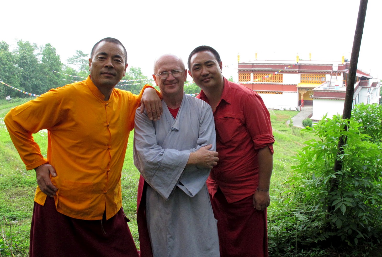 | Rinchen relaxing with Lamas Tsering and Soga at Bodhicharya Meditation Centre, Sikkim , May 2012 |